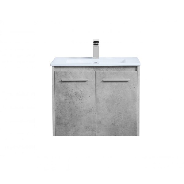 The contemporary simplicity of this 24" floating vanity in a concrete grey finish will help open the space and add stunning modern flair to your bathroom or powder room. The open space below makes it easy to show off your tiles and to clean the floor with ease--it's also the perfect place for a hamper. Double doors open to reveal plentiful of storage pace to store all of your bathroom miscellany. The clean lines that permeate through the design will surely create a fresh look in your home.