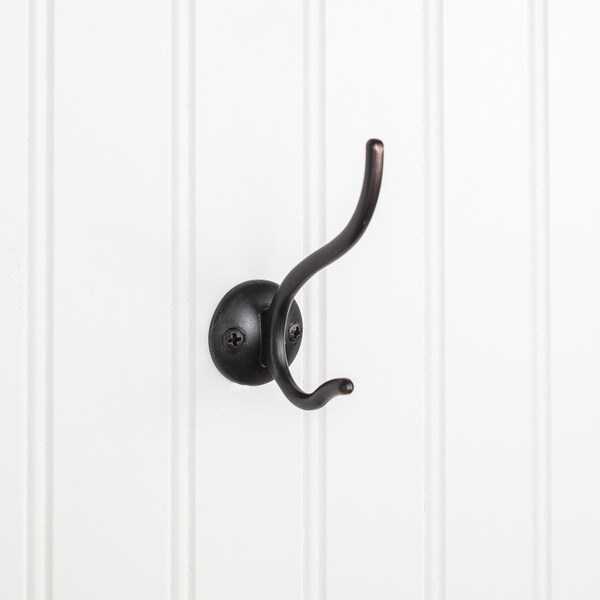 Bring a contemporary touch to your space with this Brushed Oil Rubbed Bronze slender double prong hook from Elements. Proudly display a prepared outfit in your walk-in closet, or hang a comfy robe in your bathroom, this wall hook will look fabulous in any space. This hook is available in three beautiful finishes. Each hook is weight tested to hold up to 35 pounds and individually packaged to prevent damage. Packaging includes mounting screws and installation instructions.