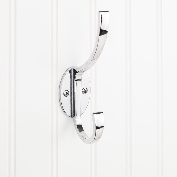 The gentle curve of this flared transitional Polished Chrome double prong hook from Elements is sure to provide an abundance of fashion and function for any space. Great for hanging clothes, jewelry, or robes, this hook is available in three beautiful finishes. Each hook is weight tested to hold up to 35 pounds and individually packaged to prevent damage. Packaging includes mounting screws and installation instructions.