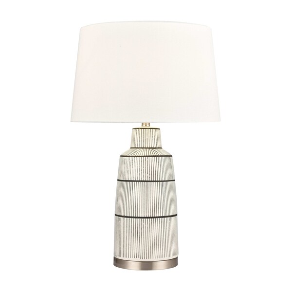 The Ansley Table Lamp brings an elevated touch to a transitional style interior. Ideal for accenting a living room console or bedside table, this earthenware design features a ribbed surface and band detailing and comes in lightly rustic, grey wash finish. Keeping the look up to date and chic, the metal appointments come in a satin nickel finish while the round hardback shade is covered with white linen.