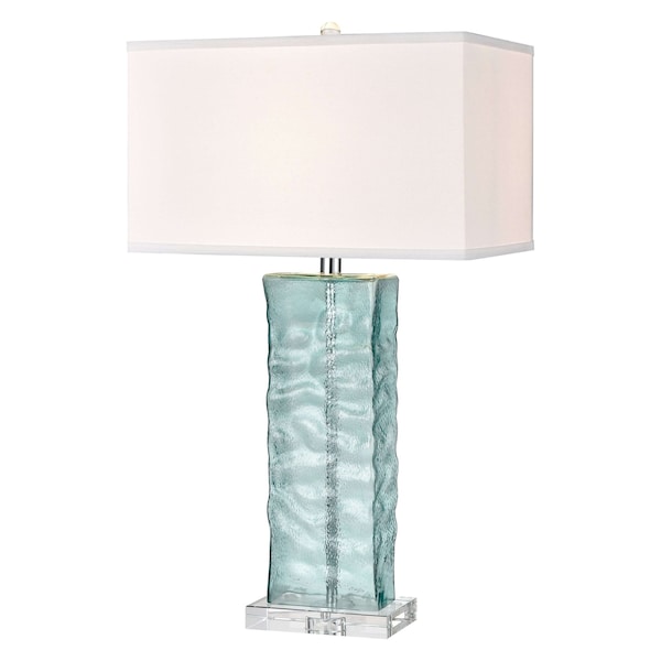 Mottled Egyptian blue glass table lamp. Slender rectangular shape with clear base. Rectangular cream hardback shade .