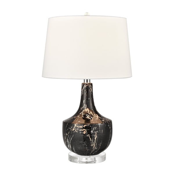 The Baxterwood Table Lamp adds instant contemporary style glam to a living room or bedroom. Made from earthenware, this piece features a striking, black faux marble finish that works with its classic, fluted vase shaped body to cut a bold silhouette. Its chic look is completed by a round, hardback shade in crisp, white linen.
