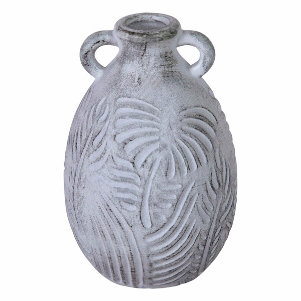 The Breeze small vase features a rounded form with amphora style handles. Made from earthenware, this curved design has been embellished with a stylized botanic motif. This piece comes in a gray washed finish giving it a subtle, rustic style.