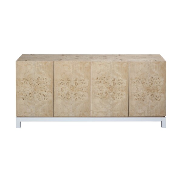 The Bromo Credenza is made from beautiful mappa burl wood with a solid wood painted plinth base. Featuring four doors that push to open to reveal inner storage shelving, this credenza offers versatile storage for a dining room or living room.