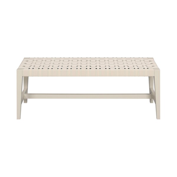 The Causeway Bench is made from sustainable, plantation-grown mahogany. The designer wood frame has a cross beam for added support, and the bench top is woven with fabric webbing.