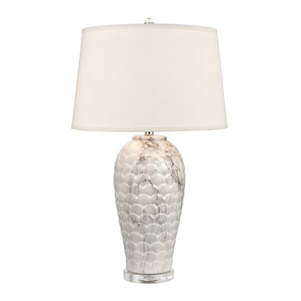 Ideal for adding an elevated transitional note a living room, hallway or bedroom, the Causeway Waters Table Lamp is made from glass featuring a pine cone textured surface and marbleized finish painted on its inside. Its classic, vase shaped body is set on a clear crystal base to add a touch of glam to its appeal. This piece is completed with a round, hardback shade in white texture linen and ball finial.