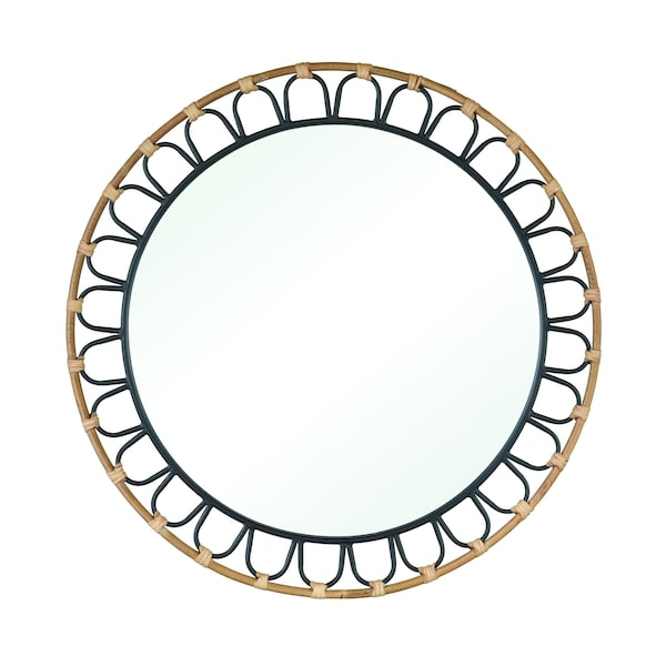 The Fisher Island Mirror is a round mirror framed in a ring of black metal loops, which are tied to a round rattan frame. The mix of industrial and coastal materials makes this a thoroughly modern and versatile statement mirror for an entry hall, bedroom or bathroom.