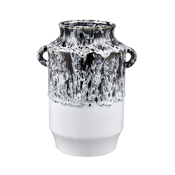 The Gallemore Vase has a simple rounded shape with two small amphora style handles near its mouth. The vase is finished with a hand-applied black and white crackling glaze that drips from the top to the center where it meets a white ceramic base.