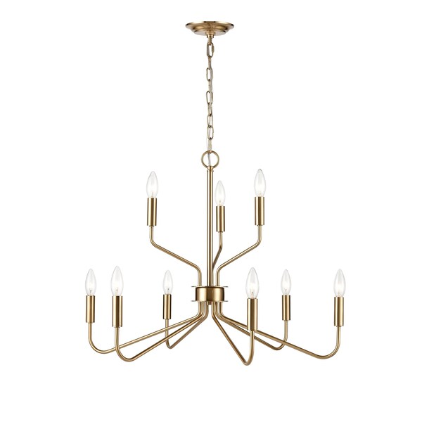 The Genista Chandelier offers impeccable contemporary style with notes of glamour. This two-tier design holds 9 bulbs and features graceful, upturned arms. Its sleek form comes in a rich satin brass finish to add instant luxe to a modern living room, dining room or entrance hall, proving that high drama and grandeur doesn't need to live in the past.