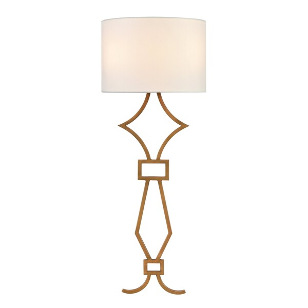 The geometric, metal body of this piece forms an open lattice, allowing it to integrate the color of the wall behind. A painted, aged brass finish and a half-oval hardback shade in off-white linen give the look a classic appeal, while remaining a versatile match for a variety of interior palettes. The Harlech wall sconce is available in both tall and short sizes.