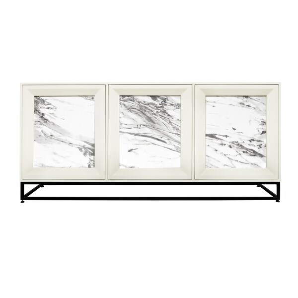 The Matthews Credenza is a three door white painted storage cabinet ideal for a dining room or living room. Doors integrate seamlessly with the frame with no hardware. Doors feature a beveled wood frame around marble laminate inserts, and open to reveal a fixed shelf offering ample storage and interior cord management. Anti tipping kit included.