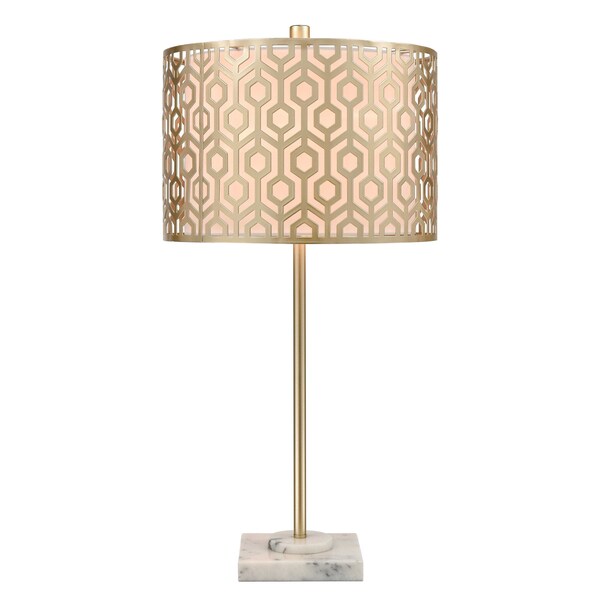 Combining elements of mid century design with modern glam aesthetics, the Meliton Table Lamp is ideal for bedrooms, living rooms or hallways. Its drum shaped, metal shade is lazer cut with a geometric pattern and is lined in white fabric to allow the light to gently filter through. The champagne gold finish on this design has been hand painted, bringing an extra layer of quality craftsmanship to its overall appeal. Adding to its opulence, the base is made from high quality, white marble. A floor lamp is also available in the Meliton range.