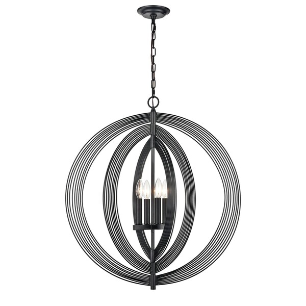 The Orme Pendant brings contemporary, sculptural style to a living room, hallway or dining area. Its spherical shape is made from layering strips made up of curved metal rods, with four bulbs at its center. The look is sophisticated and modern.