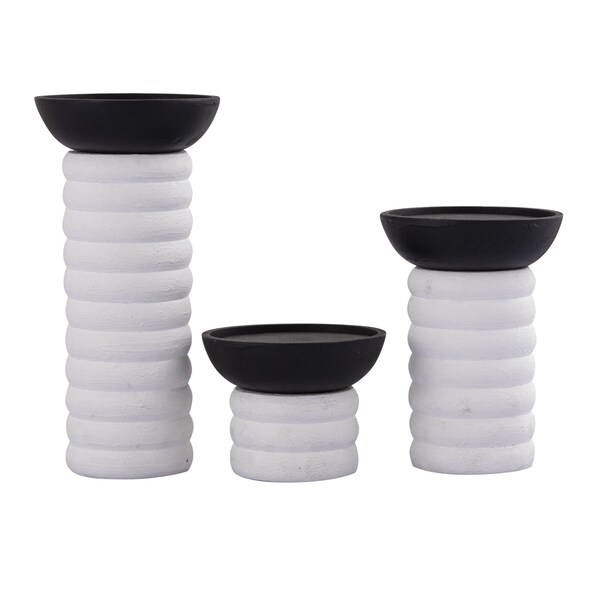 The Stack Pillar Holders, sold as a set of three, offer varying heights to display pillar candles. Each metal candleholder has a white plaster finish with a horizontal channel detailing and rounded black painted top,