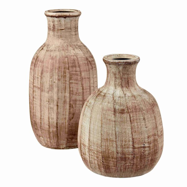 The Mink Bottles, sold as a set of two, are rounded ceramic vases with a matte weathered brown finish The traditional bottle shape has a vertically textured surface with patina, for a look that feels vintage and collected