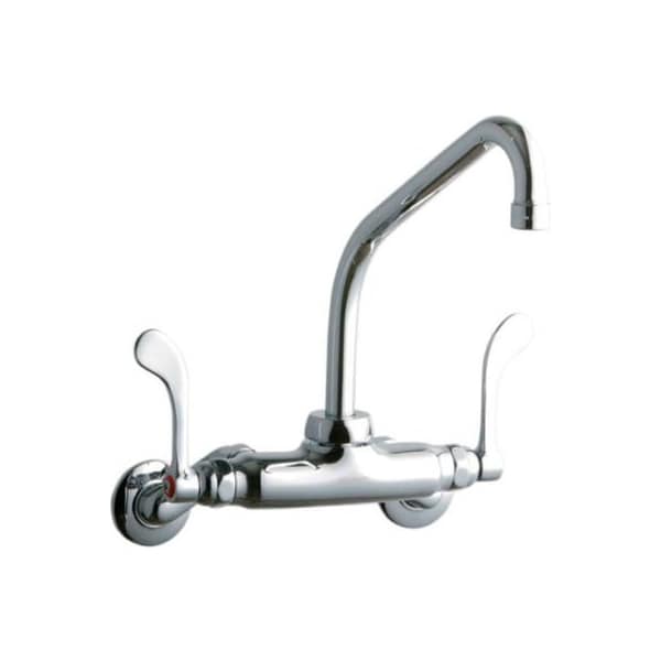 Elkay commercial faucet, lk945ha08t4t wall mnt 4in, ha 8in spt, 1pc , 2 hole, 2 handle(s), 4 wristblade handle, 8 spout reach, 9.3750 spout height brass dual lever wall mount 8 center commercial faucet. Two hole dual handle wall mount faucet. Quarter turn ceramic disc cartridge. 2 offset for adjustable inlet installation, 3-3/8 to 8-1/2. Solid brass construction with chrome finish. Includes spout swing restriction pin. Complies with: asme/ansi a112.18.1, csa b125-01, nsf/ansi 61, ada, upc/cupc, iapmo listed.