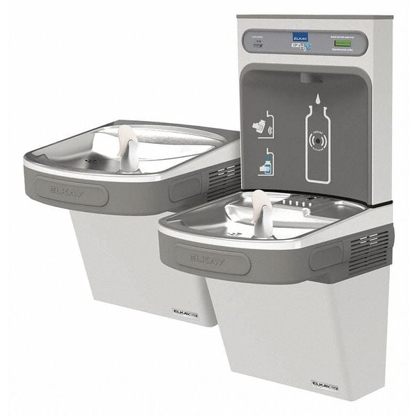 The Elkay EZH2O Bottle Filling Station delivers a clean quick water bottle fill and enhances sustainability by minimizing our dependency on disposable plastic bottles. Complete cooler and bottle filling station in a consolidated space saving ADA compliant design. NEW Versatile Bi-Level cooler design allows for standard cooler installation of high-left/low-right or the alternate reverse cooler installation.
