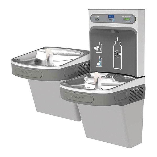 Drinking Fountain with Bottle Filler, Station Type Two Station Fountain, Bottle Filling Dispenser, Fountain Actuation Front Pushbar/Side Pushbar, Bottle Dispenser Actuation Sensor, Includes Water Filter Water Filter Included, ADA Compliant ADA Compliant, Cooling Capacity 8 gph @ 50 Degrees F, Housing Color Gray, Overall Height 39 1/16 in, Overall Depth 19 in, Overall Width 18 3/8 in, Mounting Location Wall Mount, Bi-Level Field Adjustable Not Bi-Level Field Adjustable