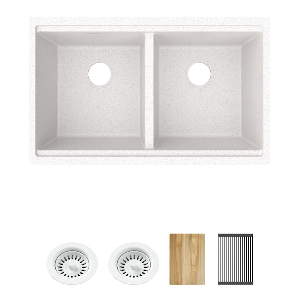 Quartz Classic 33" x 22" x 9-1/2" Equal Double Bowl Undermount Workstation Sink 4pc Kit White