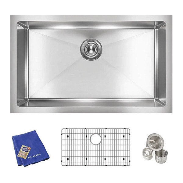 Custom fit bottom grid, deep strainer drain, Bar Keepers Friend cleanser, microfiber towel, all packed in an Elkay protective cloth bag.