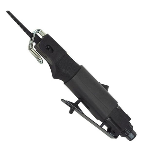 Air Body Saw is a great tool for the home shop garage even the job-site. Perfect for tackling all medium gauge cutting jobs Emaxs slim-line design allows user to steel aluminum plastic fiberglass and wood smoothly and effectively. A lightweight aluminum housing with industrial grade powder-coat finish provides rugged durability while reducing user fatigue. An ergonomic industrial grade TPR grip reduces vibration and provides maximum comfort & control in cutting even curved surfaces and tight circles. The Emax features a smooth three finger trigger throttle with built-in lock-off feature which prevents accidental starts and a steel blade guard that doubles as a tool slide for optimum safety. Emax also incorporates a rugged composite chuck cover & front deflecting exhaust port that cleans working surfaces during use. Specifications. Dimensions: 12in H x 4in W x 2in L.