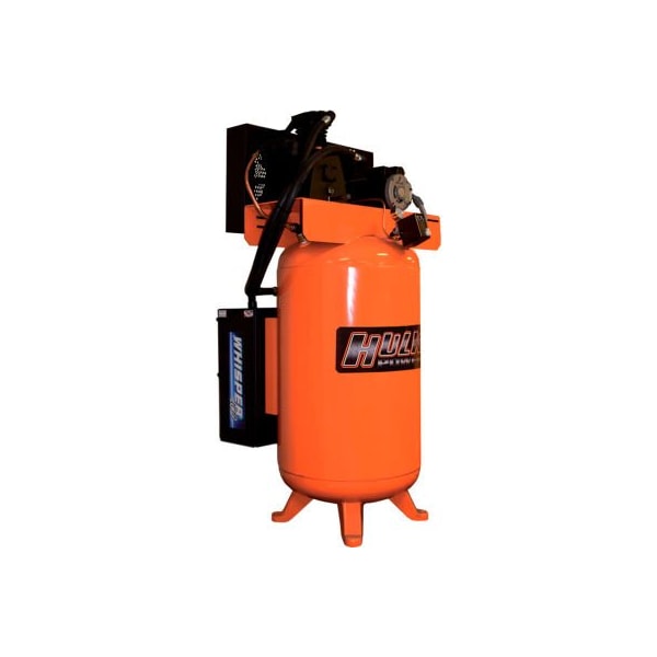 Hulk powered by emax 7.5hp silent air 2-stage compressor, 80 gal, vertical, 125 psi, 5.77 cfm, 208/230v hulk power by emax features our whisper 100 patented silent air noise suppression system. features ball valve tank drain easy tank maintenance magnetic starter 1750 low rpm industrial odp electric motor 80 gallon asme certified tank solid cast iron 2 stage 3 cylinder, low rpm pump oil drain valve 2- v style belts b groove 13 gauge steel belt guard 4 year full warranty