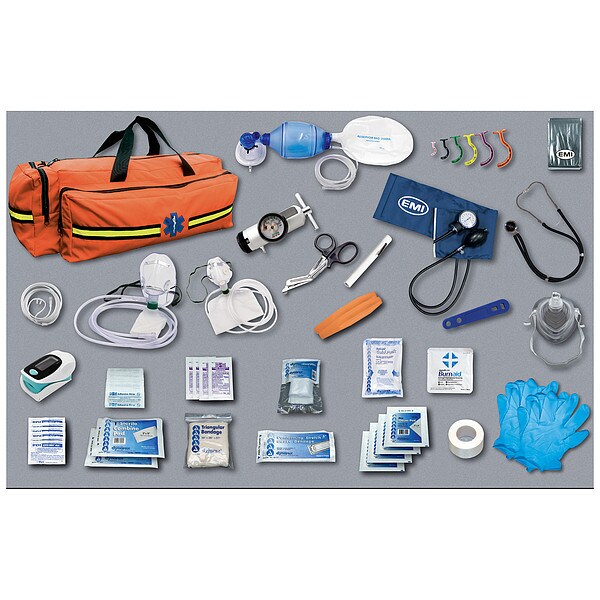 Emergency Oxygen Response Kit, Product Type Emergency Oxygen Response Kit, Application First Responder, Number of People Served 4, Number of Components 51, Number of Pockets 2, Adhesive Bandages Included (20) Adhesive Bandages, Adhesive Tape, Wound Dressings Included Burn Dressing, Emergency Pressure Bandage, Sterile Conform Bandages, Triangular Bandage