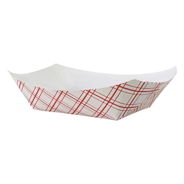 The Empress Red Plaid food tray features a white base with a red plaid design and high-quality paperboard sides. It has a 1/2 lb capacity and is clay-coated to resist spills and leaks. PFAS-free and leak-resistant, this tray is designed for easy portability with walled sides that hold a variety of foods such as fries, hot dogs, and wings. Sold in a pack of 1000, these stackable trays are ideal for efficient storage and are suitable for use at festivals, outdoor gatherings, food trucks, sporting events, concerts, and sample distributions.
