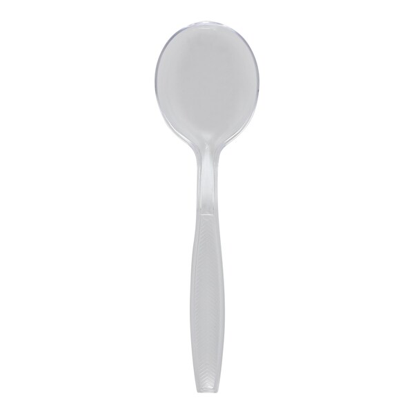 The Banquet Heavy Weight Soupspoon from the Empress Banquet line features a clear plastic design made from a higher density formulation for added strength and rigidity. This heavyweight soupspoon is ideal for use in cafés, food trucks, parties, and various food service settings. Its durable construction ensures versatility and reliability in serving soups and other liquid dishes. The clear color allows for a clean, unobtrusive appearance suitable for multiple applications. Available in a pack of 1000, it offers excellent value for high-volume needs.
