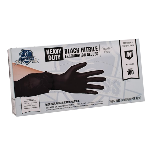 Heavy Duty Nitrile Glove in Medium size features a black color and a 5 mil thickness designed for exam grade use. Made from durable nitrile material, these gloves offer resistance to punctures and chemicals, suitable for various medical, industrial, and laboratory applications. The gloves provide a secure fit and tactile sensitivity while ensuring protection during extended wear, available in a pack of 1000.