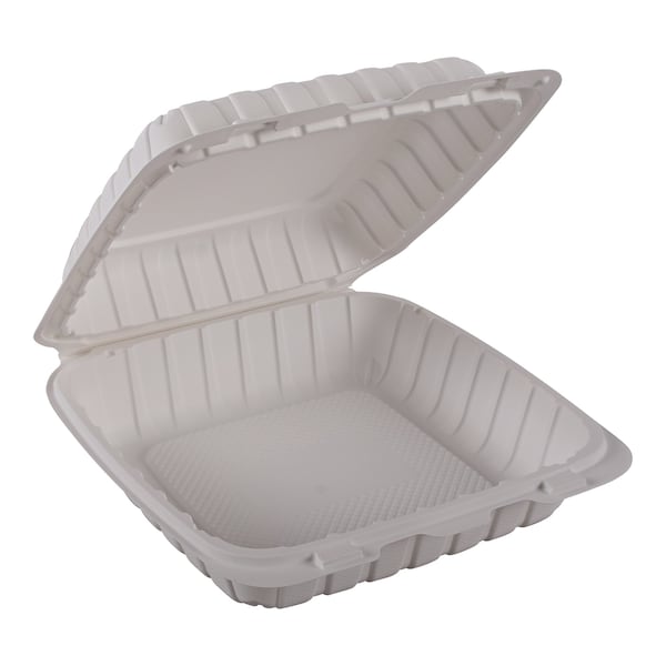 This hinged container is made from mineral-filled polypropylene in a natural color, measuring 9 by 9 by 3 inches with one compartment. It features a durable clamshell design with textured ribbed sidewalls for added strength and dual lock bars to secure closure during transport. The container is grease and liquid-resistant, microwave and freezer-safe, and recyclable. Its space-saving design allows for stacking, making it suitable for takeout, delivery, and leftovers. Sold as a pack of 150, the container is 100 percent compostable and produced from bagasse using natural resources.