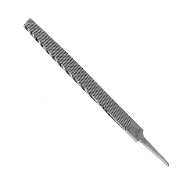 Flat File. Smooth Cut Coarseness. Flat files used on flat, broad surfaces, and sharp corners, generally by machinists, builders, and repairmen. Double cut, single edges, and slightly tapered. Tang is the tapered end of the file that can either be used to hold the file or inserted into an optional handle. Made from Chromium alloy steel.