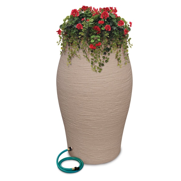Stoneware Urn Rain Barrel, Includes Planter, Diverter, Outlet Hose, 85 Gallons, Sand
