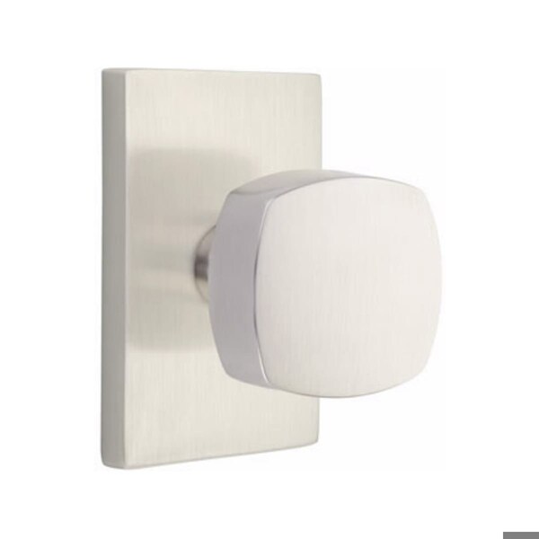 Emtek is dedicated to helping bring your personal style to life. Door hardware is more than a way to open, close, and secure a space. To us, it is an integral part of a room's design theme. Each order is custom assembled in our Southern California facility. There is no predetermined combination of knobs, levers, rosettes and finishes; we let you mix and match according to your own taste. Door hardware should make a statement, your statement.. Freestone Knob 2-3/8 in Backset Privacy With Modern Rectangular Rose for 1-1/4 in to 2 in Door Satin Nickel Finish