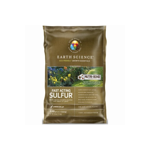 Earth Science 25 LB 5,000 SQFT coverage Fast Acting sulfur High quality sulfur lowers pH in high alkaline soil, releasing existing nutrients fertilizers so they may be taken up by the roots to feed the plants Excellent for acid loving plants such as azaleas, rhododendrons berries Features NutriBond technology which holds nutrients in place for maximum effectiveness reduction of nutrient run off Contains a rich source of calcium essential for plants to better take in nutrients