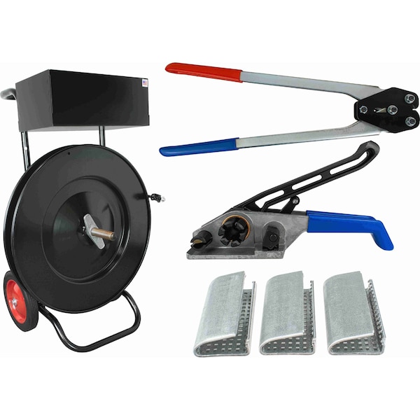 - It includes a dispenser cart, sealer, tensioner, and seals for 1/2" strapping.