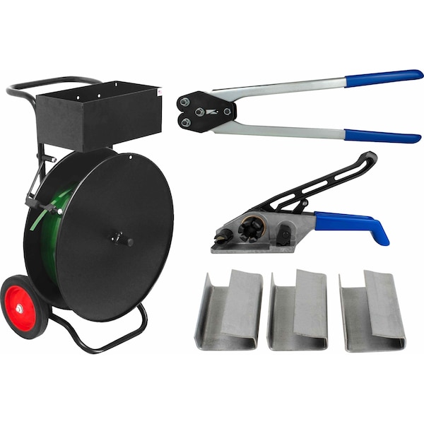 - It includes a cart dispenser, sealer, tensioner, and seals for 3/4" strapping.