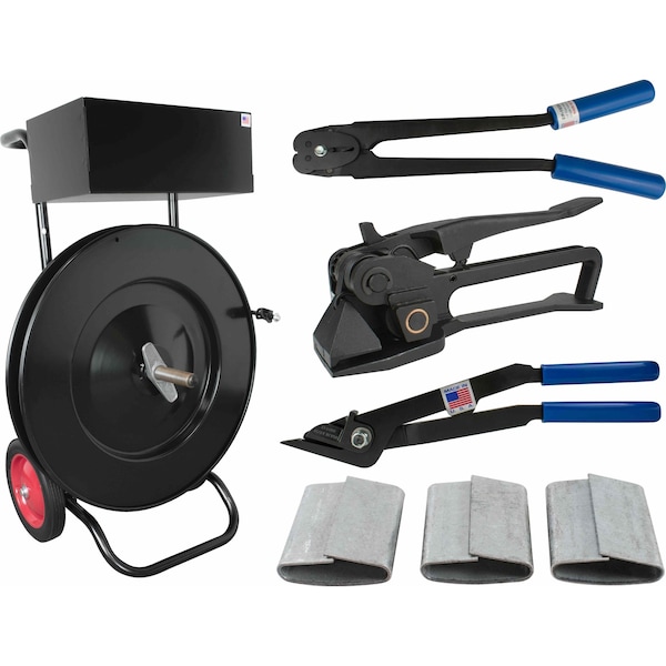- It includes a cart dispenser, sealer, tensioner, steel cutter, and seals for 5/8" strapping.