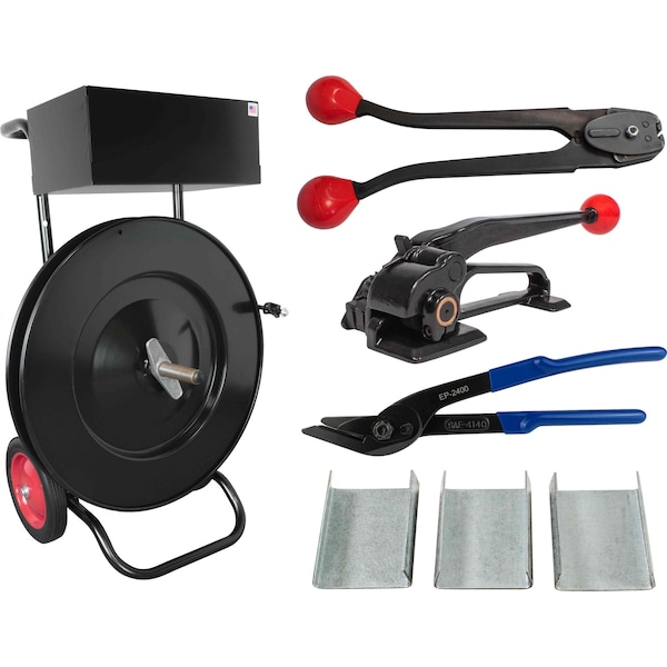 - It includes a cart dispenser, sealer, tensioner, steel cutter, and seals for 3/4" strapping.