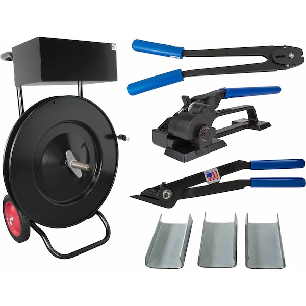 - It includes a cart dispenser, sealer, tensioner, steel cutter, and seals for 1/2" strapping.