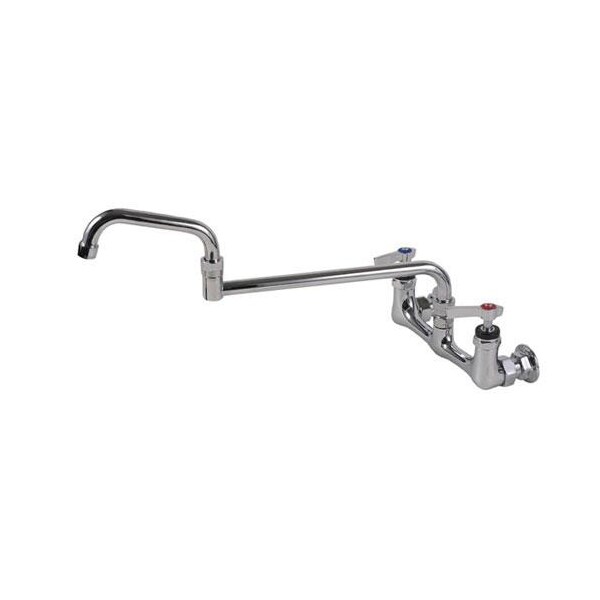 Wall mount faucet; Ideal for high use sinks; Low lead compliant; 8 in center; 18 in double jointed swivel spout; 1/2 in pipe size; 1/4 turn stems; Standard lever handles; Chrome plated brass; Inlet couplings adjust for minor pipe center variations; NSF certified to standard 61; Heavy duty; Replaced KN54-8018