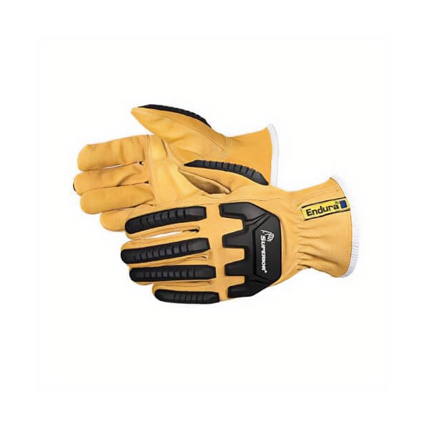 Endura anti-impact driver gloves series: 378GKGVB, extra-large size, OilBloc goatskin leather palm, goatskin leather /TPR, tan, seamless style, Kevlar lining, elastic/knit wrist cuff, resists: oil, puncture and water.