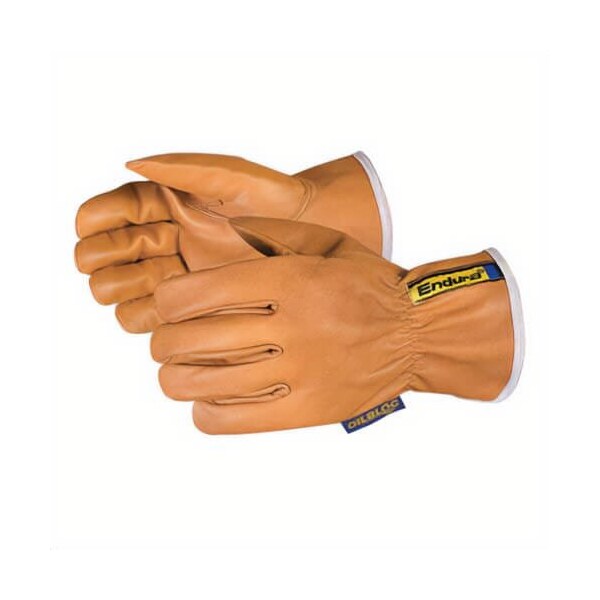 Superior Glove Endura general purpose gloves series: 378GOBKL, drivers glove type, extra-large, Oilbloc/Grain goatskin leather, tan, summer/seamless style, Kevlar lining, slip-on cuff, resists: abrasion, arc flash, cut, flame, oil, spark and stain.