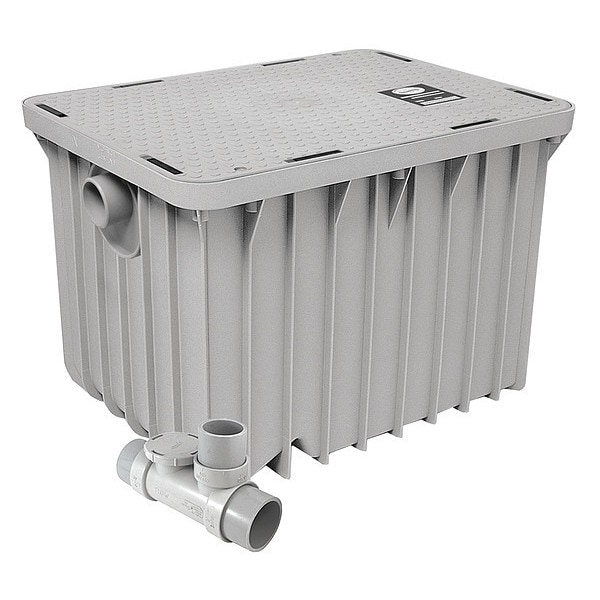Grease Interceptor, Outlet Connection Type No Hub, Application Fat, Grease, Oil, Overall Depth 17 1/2 in, Overall Width 23 5/8 in, Color Gray, Features Dynamic Baffle, Pedestrian Rated Access Cover, Silicon Odor Seal, Maximum Temperature 220 Degrees F, Standards PDI-G101, ASME A112.14.3, CSA B481.1, UPC Listed, Comm. Of Mass., Inlet Pipe Size 2 in, Finish Unfinished, Flow Rate 15 gpm, Capacity 30 lb, Includes Flow Control, Material Plastic, Inlet Connection Type No Hub, Outlet Pipe Size 2 in