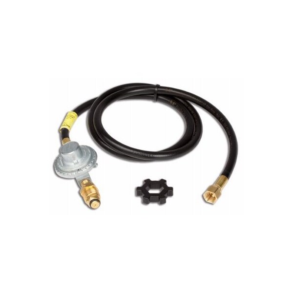 5', Propane Hose With Regulator Assembly, Regulator With Restricted Flow Soft Nose POL Hand Wheel x 38 Female Flare, Connects Low Pressure Portable Propane Appliances To A 20 LB Cylinder