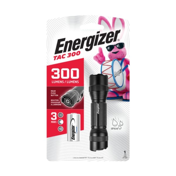 Flashlight, Battery Chemistry Lithium, Battery Size CR123, Includes Batteries Yes, Number of Batteries 1, Rechargeable No, Beam Pattern Spot, Body Color Black, Body Material Aluminum, Lighting Technology LED, Number of Light Output Modes 2, Maximum Beam Distance 100 m, Maximum Brightness 300 lm, Run Time at Maximum Brightness 2 hr, Weight with Batteries 2.9 oz, Includes Charger No, Beam Color White, Beam Focus Fixed, Includes Secondary Light No, Drop Rating 1 m