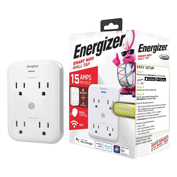 When it comes to power' you want a place to keep multiple items connected when needed. The Energizer Smart WiFi 4-Outlet Wall Tap can provide you with all the power your items require. With 4 outlets' you'll be able to have everything powered at once. The top 2 outlets are always powered' while the bottom 2 are linked to the Energizer Connect app for complete control including timer and smart scenes programming. You can also link to Alexa' Siri' or Google Assistant for full voice activation over your device. It plugs into a standard electrical outlet with the tap receiving power from the top socket and a bottom piece that stabilizes to the lower socket. Link it to your existing WiFi setup without any additional hubs or pieces required. Power multiple items for your daily routine with the 4-Outlet Smart WiFi Wall Tap from Energizer.