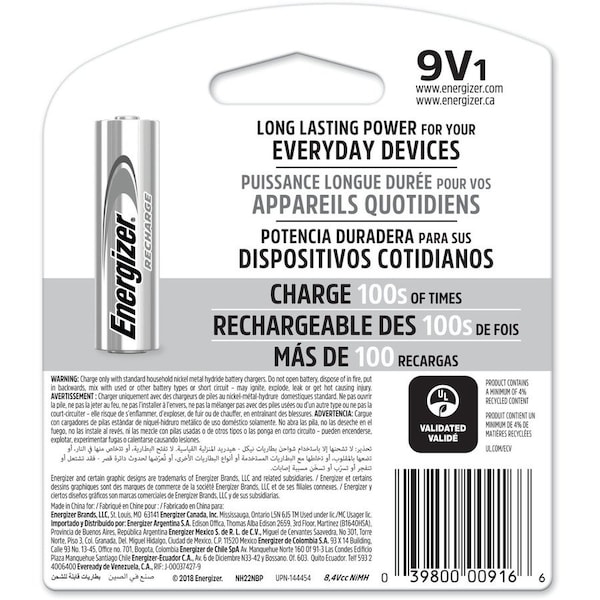 Rechargeable Battery, Battery Size 9V, Battery Chemistry Nickel-Metal Hydride, Voltage - Batteries 8.4V DC, Recharge Time 8 hr, Capacity - Batteries 175 mAh, Shelf Life 3 yr, Rechargeable Up To 300 Times, Precharged Yes, Max. Operating Temp. 122 Degrees F, Min. Operating Temp. 32 Degrees F, Standard Battery Pack Size 1, Standards ANSI-7.2H5, Height 1.8 in, Overall Height 1.9 in, Width 1 in, Depth 0.7 in, Standard Battery Series Recharge