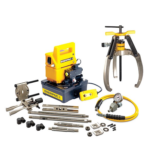 Hydraulic Puller Set, Cylinder Nominal Capacity 14 ton, Stroke Length 1 in, Capacity with Attachments 7 ton, Number of Jaws 3, Max. Jaw Spread 14.96 in, Min. Jaw Spread 4.92 in, Max. Reach 10.24 in, Max. Pressure 10,150 psi, Application For Pushing or Pulling, Includes Bearing Cup Puller, Bearing Separator, Cross Bearing Puller, Cylinder, Electric Pump, Hose, Jaw Puller, Pressure Fitting, Pressure Gauge, Replacement Point Protector, Weight 40 lb