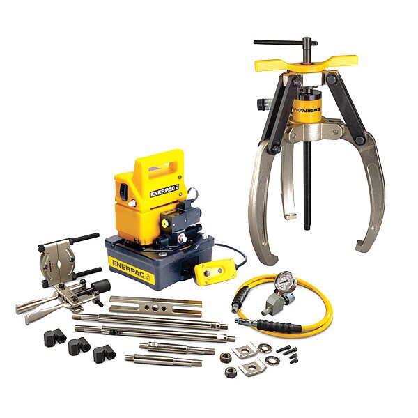 Hydraulic Puller Set, Cylinder Nominal Capacity 24 ton, Stroke Length 2 in, Capacity with Attachments 12 ton, Number of Jaws 3, Max. Jaw Spread 18.9 in, Min. Jaw Spread 6.5 in, Max. Reach 13.23 in, Max. Pressure 10,150 psi, Application For Pushing or Pulling, Includes Bearing Cup Puller, Bearing Separator, Cross Bearing Puller, Electric Pump, Hollow Plunger Cylinder, Hose, Jaw Puller, Pressure Gauge, Replacement Point Protector, Threaded Hollow Saddle, Weight 106 lb